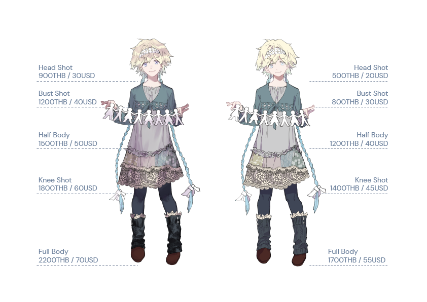 - การจ้างคอมมิชชั่นนั้นจะถือว่าผู้จ้างได้อ่านรายละเอียดด้านล่างและยอมรับแล้ว- ราคาทั้งหมดนี้เป็นราคาสำหรับใช้ส่วนตัว (Personal Use) เท่านั้น ในกรณีใช้เชิงพาณิชย์ (Commercial Use) กรุณาแจ้งด้วยนะคะ
